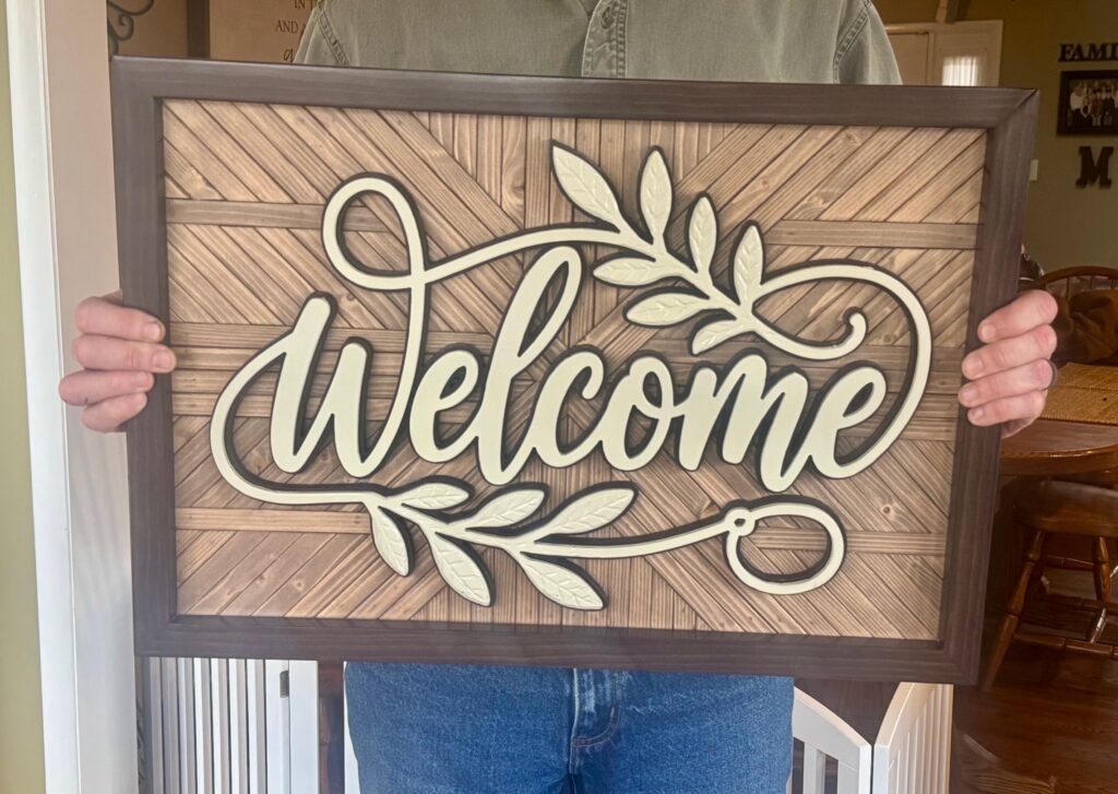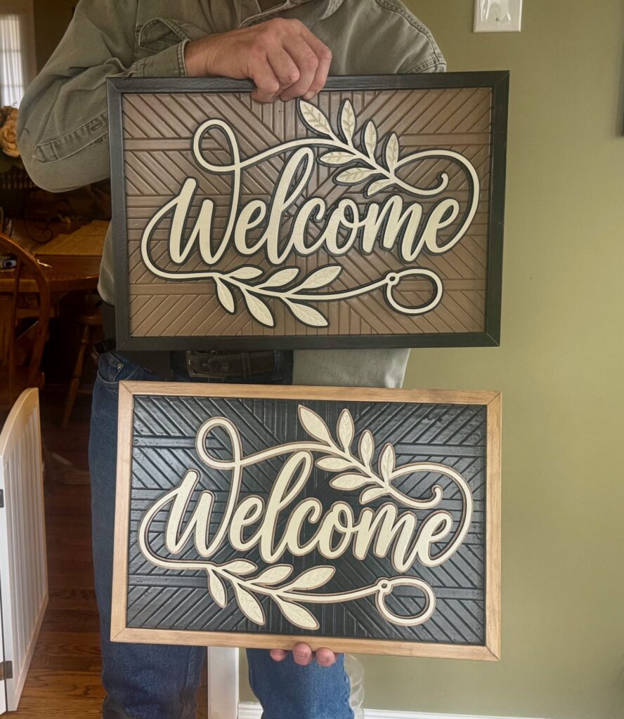 Home decor “Welcome” signs. These signs feature a multi-layer look with a shadow layer behind the text for an awesome effect in any type of lighting. Available in 2 sizes with a painted background or with individually stained slats (larger size only).